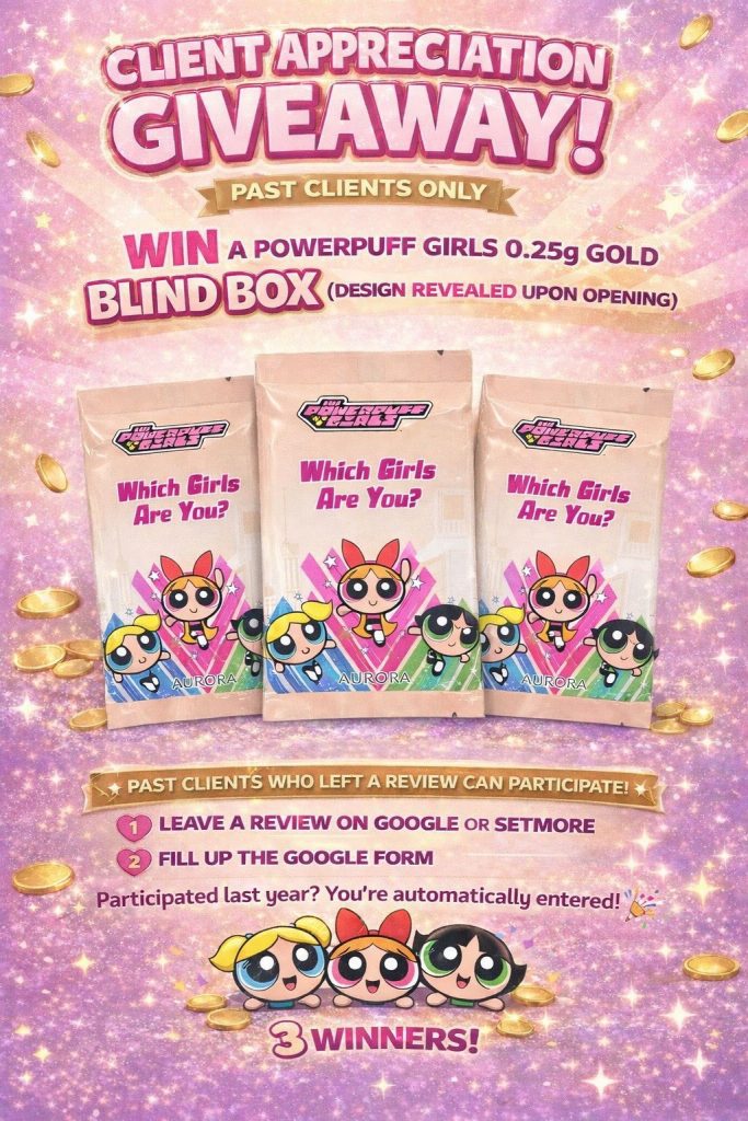 Stand a chance to win a Powerpuff Girls 0.25g Gold Blind Box from Public Gold, with the design revealed only upon opening.